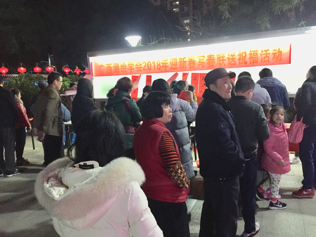 为喜迎狗年春节,营造欢乐、祥和、浓郁的节日氛围,进一步弘扬优秀传统文化,活跃会员文化生活,2月7日晚上,广西测绘学会2018年迎新春写春联送祝福活动在南宁举行,会员单位5位书法爱好者、文化志愿者带着满满的爱挥毫泼墨,现场书写大红春联和大红福字,为测绘职工及家属送上浓浓的新年祝福,构成一道独特的年俗文化景观。